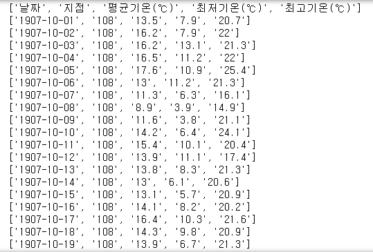 if min_temp > row[-1]: #만약 지금까지 최고 기온값보다 현재 행의 최고 기온 값이 더 크다면