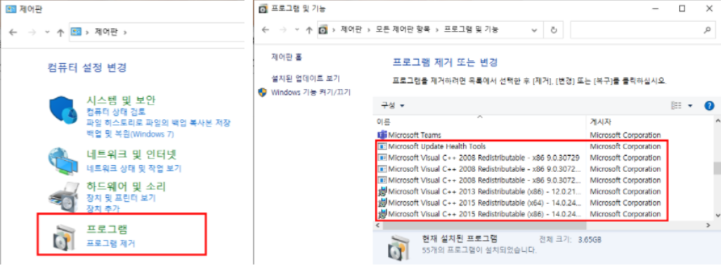 "Microsoft Visual C++ 20XX Redistributable ~~~" 형식으로 된 모든 프로그램들 제거