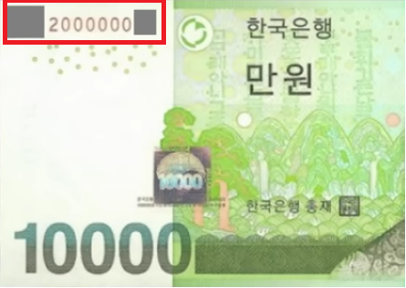 그다음 일련번호는 100000,200000 이런 식으로 일련번호가 된 것들이 있는데 이런 것을 밀리언노트라 합니다. 이런 밀리언노트식 일련번호는 약 60만원 이상의 가치가 있다고 하네요.