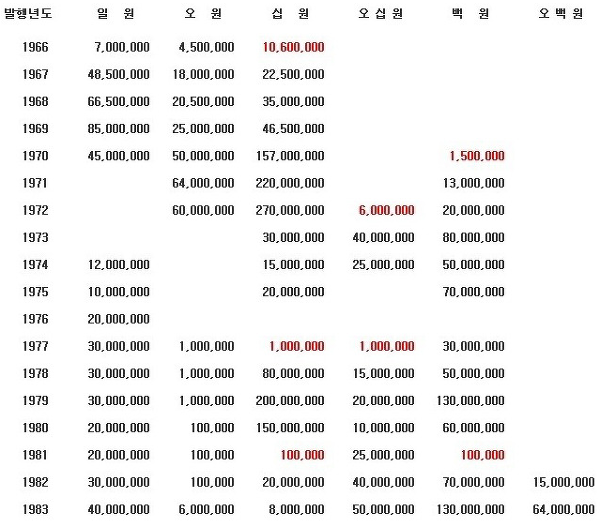 아래 표는 동전별로 1원, 5원, 10원, 50원, 100원, 500원 별 발행량을 표로 정리한 것인데요.