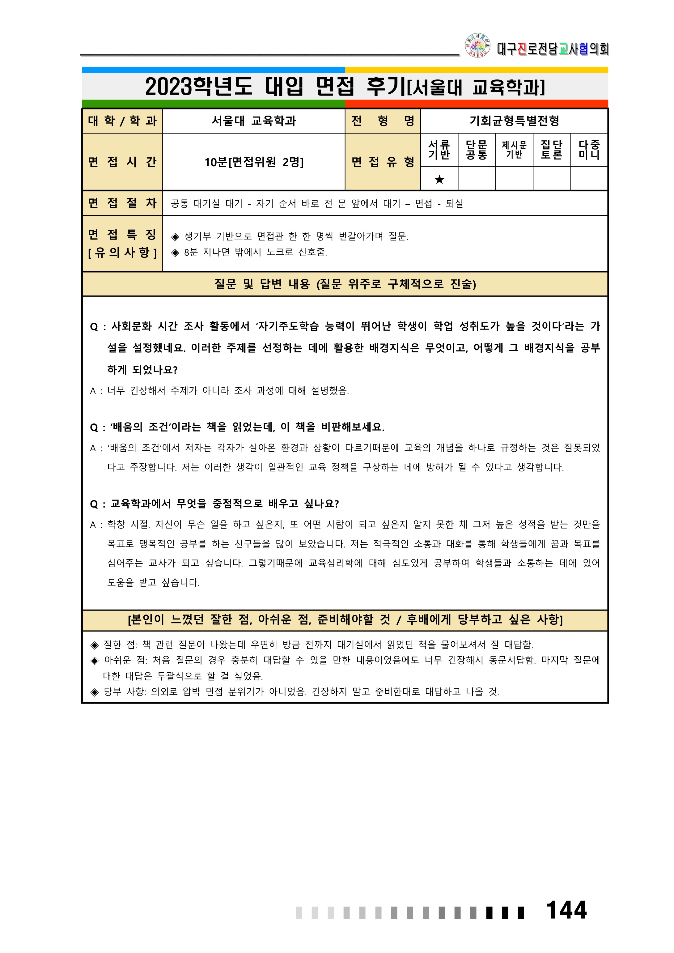 지금까지 2023학년도에 서울대학교 사범대학 출제 면접 질문 총정리해보는 시간을 갖었습니다.