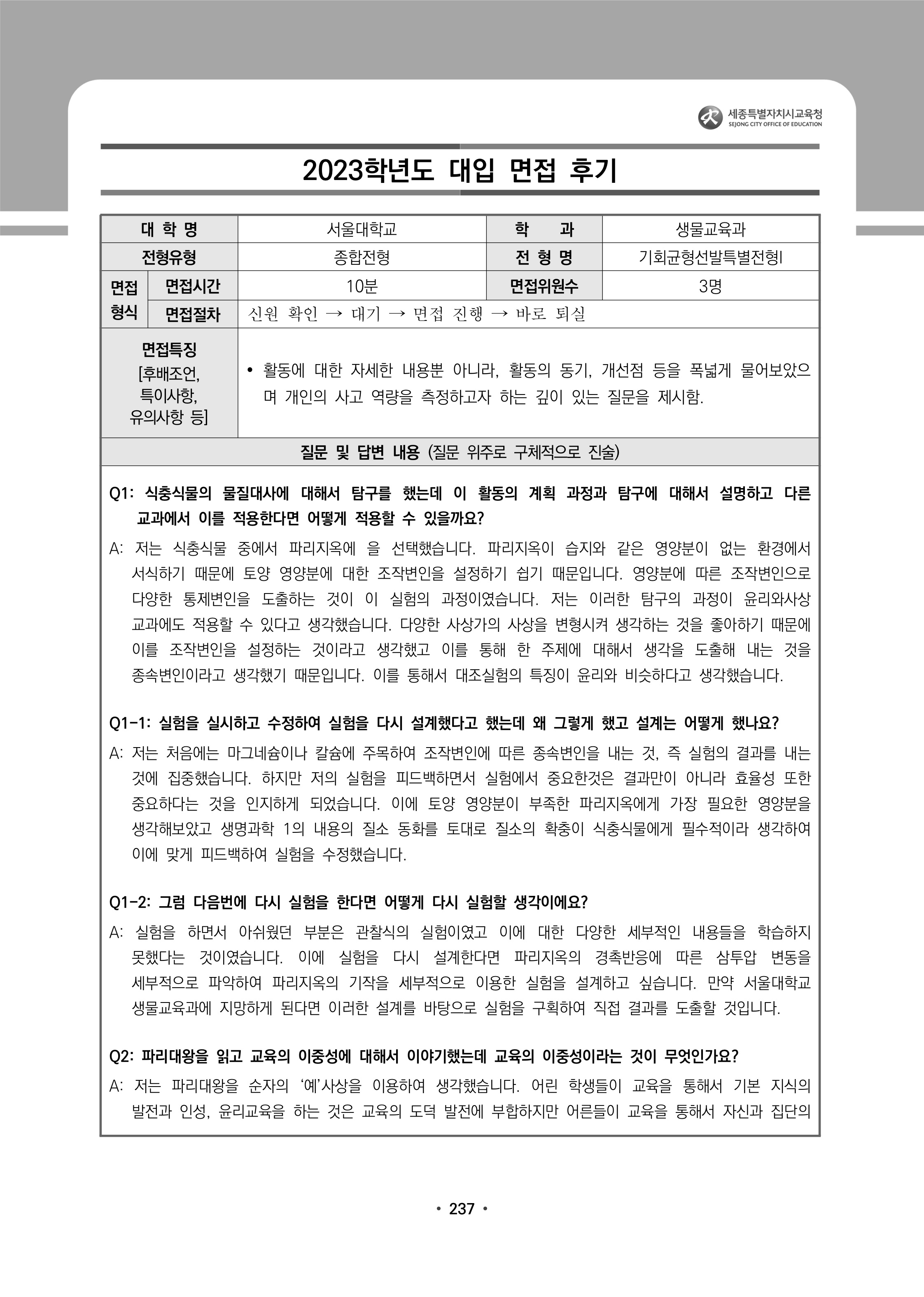 2023학년도 서울대학교 사범대학 면접 후기4 - 생물교육과