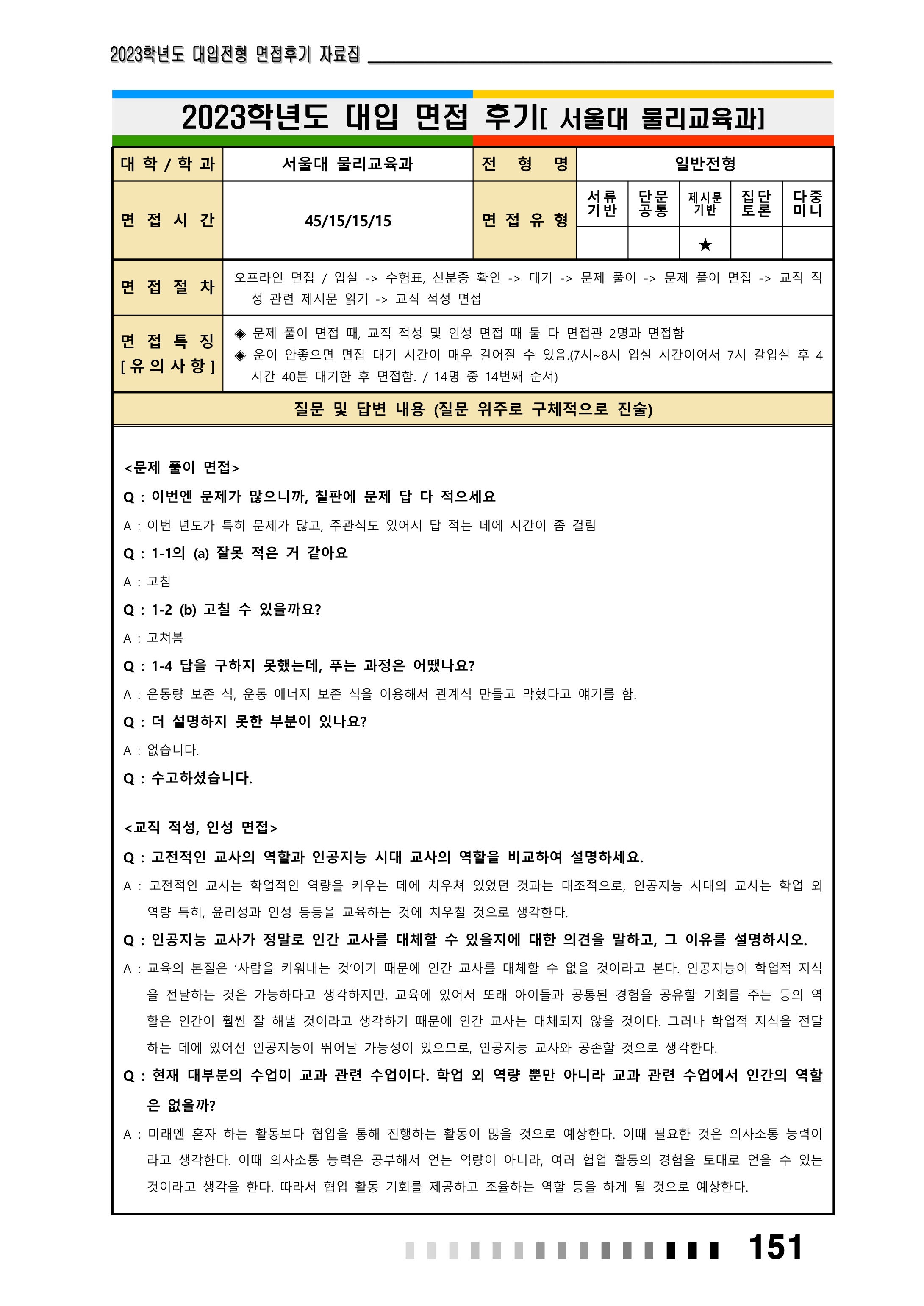 2023학년도에 서울대학교 사범대학 출제 면접 질문 총정리 본문