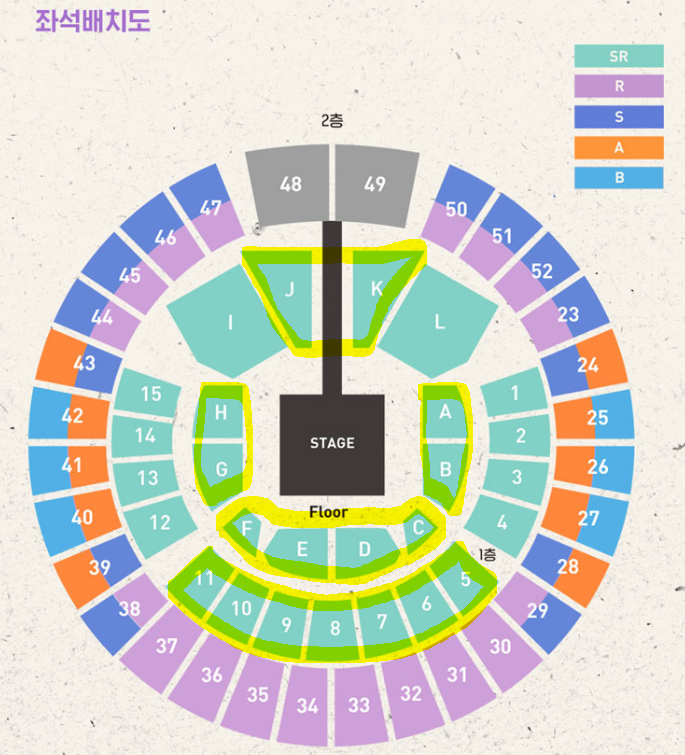 1,2,3,4,12,13,14,15 구역이 4순위에 해당됩니다. 사이드 시야이긴 하지만 무대가 360도 공연이 가능하기 때문에 무대와 가까이서 가수들을 볼 수 있습니다.