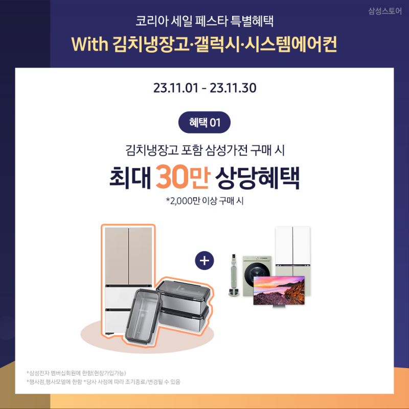 그리고 김치냉장고 포함 삼성가전 구매 시최대 30만 상당혜택을 받을 수 있다고 합니다. 단 2000만원 이상 구매시라는 조건이 붙는 것으로 보아 혼수 가전을 준비하는 가정이나 가전제품을 모두 변경할 때가 된 분들에게 적합한 행사 같습니다.