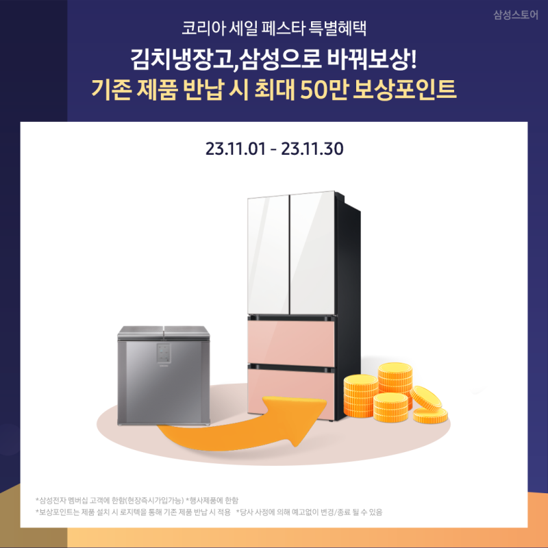 김치냉장고를 삼성 제품으로 변경할 때 기존 제품 반납 시 최대 50만 보상포인트를 드리는 행사를 진행하네요.