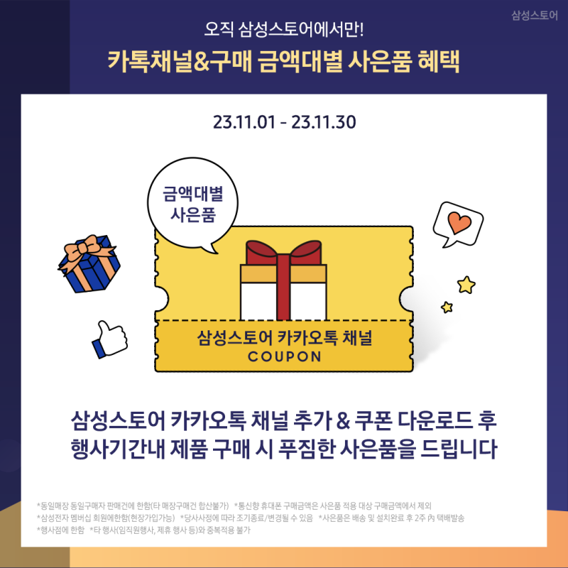 오직 삼성스토어에서만!카톡채널&구매 금액대별 사은품 혜택(23. 11. 01 – 23. 11. 30)
