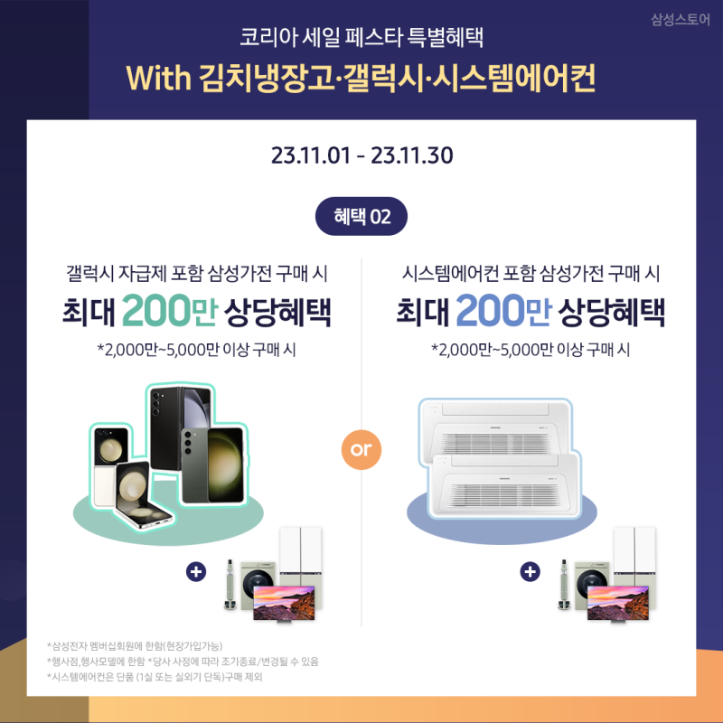 김치냉장고, 김치플러스와 같은 가전을 패키지로 구매할 때 할인 행사를 제공함은 물론, 시스템 에어컨과 같은 다양한 가전제품 그리고 갤럭시까지 바로 할인받아 구매가 가능합니다.