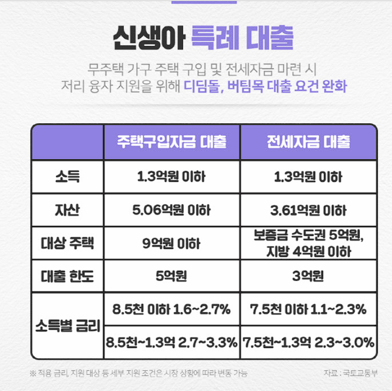 신생아 특례 대출은 무주택 가구 주택 구입 및 전세금 마련시 저리 융자지원을 위해 디딤돌, 버팀목 대출 요건을 완하한 것이 특징입니다.