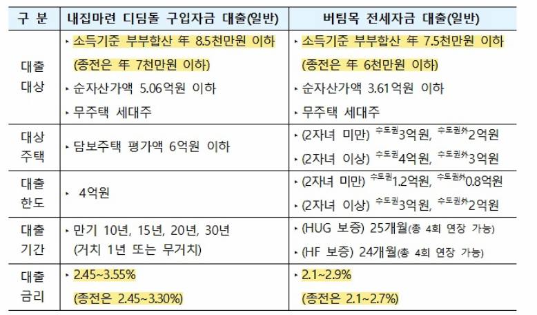 기존 내집마련 디딤돌 구입자금 대출 조건을 확인해 보면 소득 기준으로 부부합산 연 8.5천만원 이하만 대출 대상에 포함된 것을 보면 기존 대출요건보다 2배정도 소득 기준이 상항된 걸 확인할 수 있습니다.