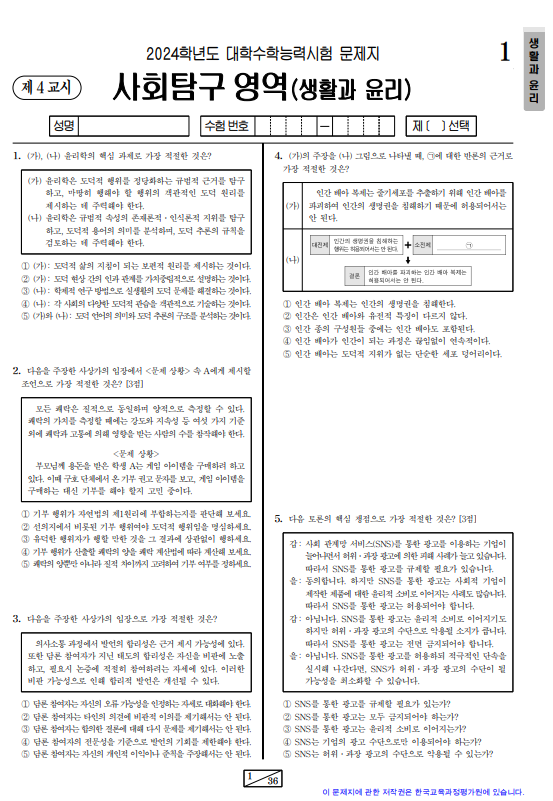 2024학년도 수능 생활과 윤리 기출 문제 및 정답