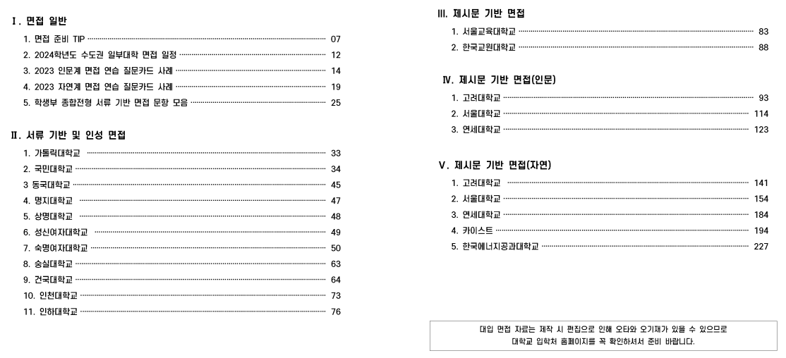 2024 대입 수시 면접 자료 PDF 파일은 다음과 같은 목차로 구성이 되어 있습니다.
