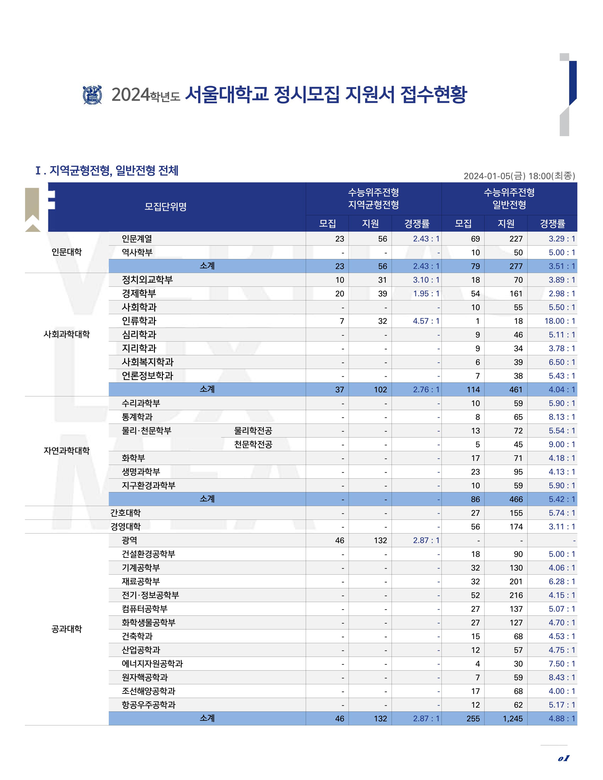 2024학년도 서울대학교 정시모집과 관련해 지원서 접수현황과 경쟁률을 살펴보도록 하겠습니다.