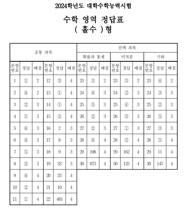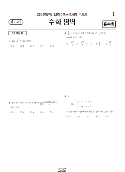2024 수능 기출 문제 수학 영역 기출문제 정답 다운로드