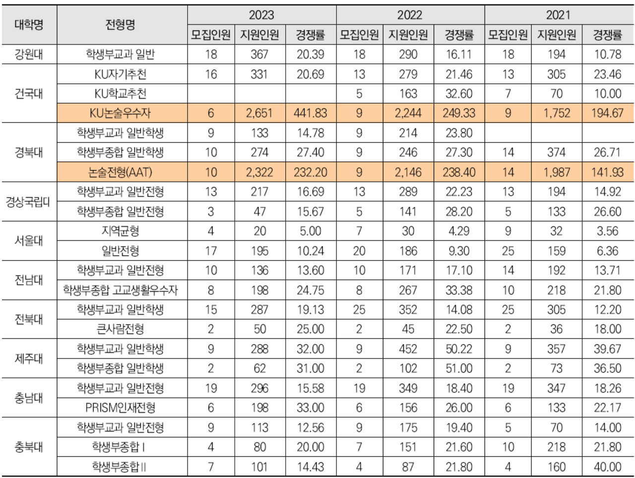 | 대학명 | 일반 | 지역균형 | 지역인재 | 교과우수자 |