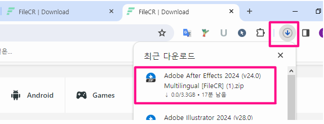 브라우저 상단에 다운로드가 표시가 되는 걸 확인하실 수 있습니다.