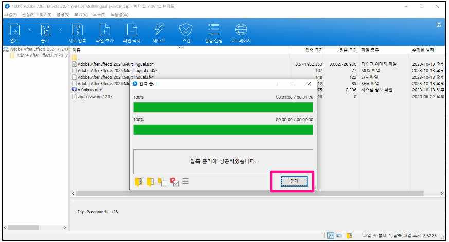 압축 풀기에 성공하였다면 닫기를 클릭하세요.