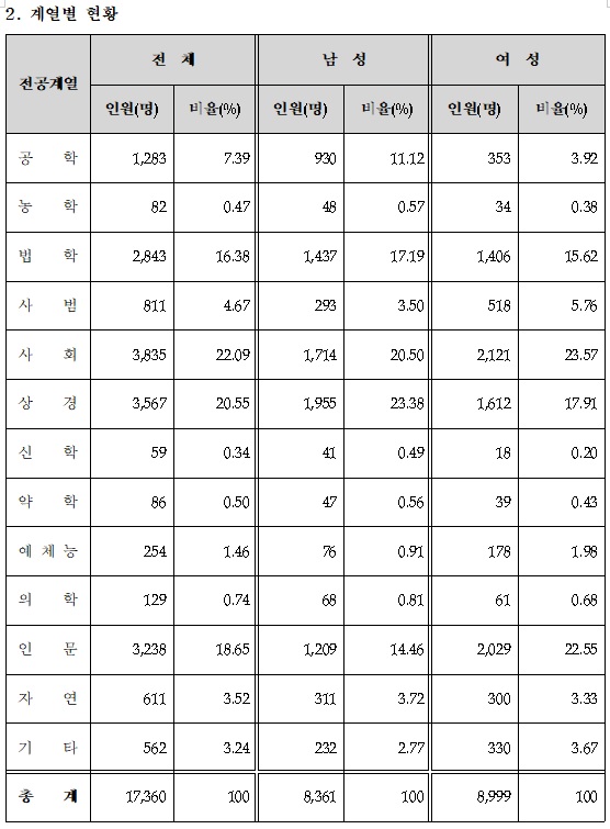 사회계열이 22.09%로 상경계열 20.55%를 근소한 차이로 앞서면서 가장 높은 비율을 보였습니다.