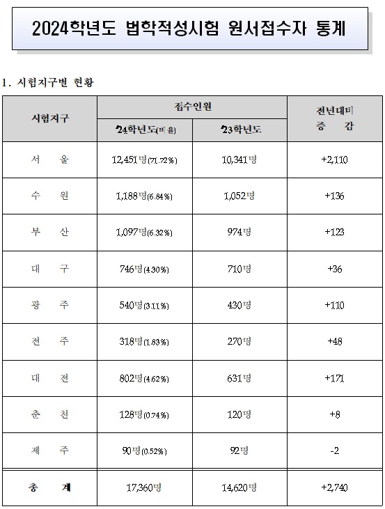2024학년도 법학적성시험 최종 응시원서 접수인원은 2023년도 14,620명보다 2,740명(18.74%) 증가한 17,360명으로 집계되었습니다.그 중 여성 8,999명(51.84%), 남성 8,361명(48.16%)이 접수하여 여성의 비율이 더 높았습니다.