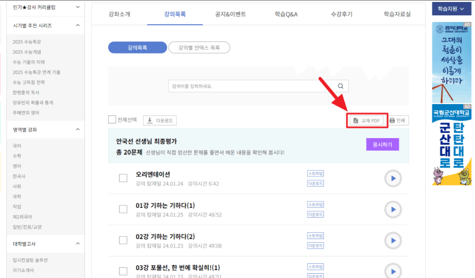 5. 아래처럼 강의목록 탭으로 들어가 [교재 PDF]를 선택