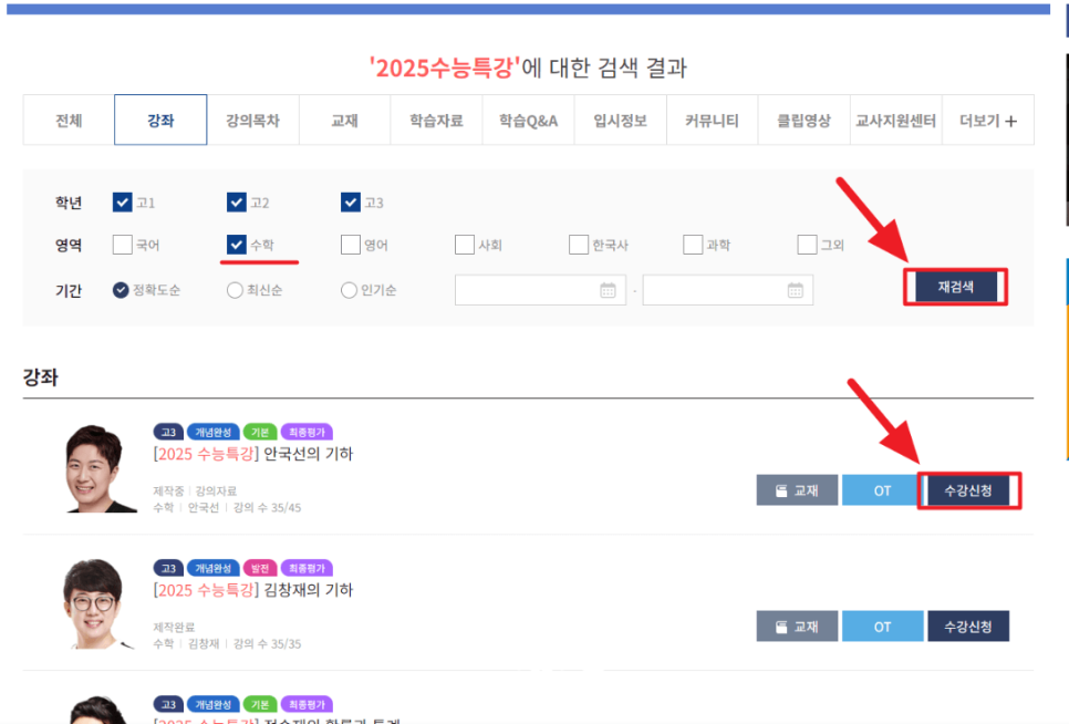 4. 영역에 원하는 과목이 있다면 체크 후 [재검색]을 누르고, 하단의 원하는 강좌의 [수강신청] 즉, 원하는 과목과 선생님을 선택했다면 수강신청으로 나의 학습방에 수강신청을 하실 수 있어요.
