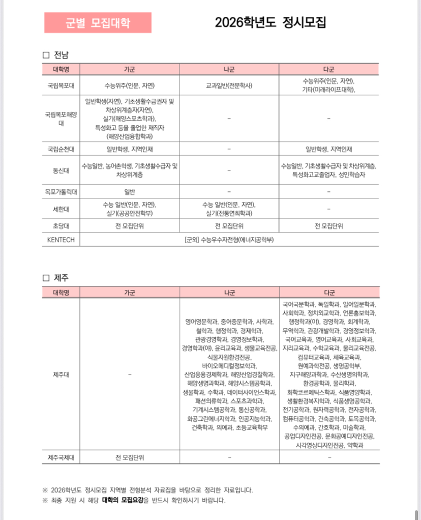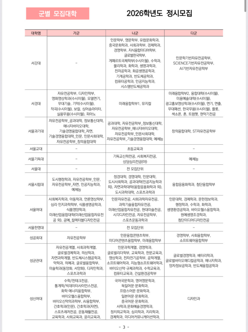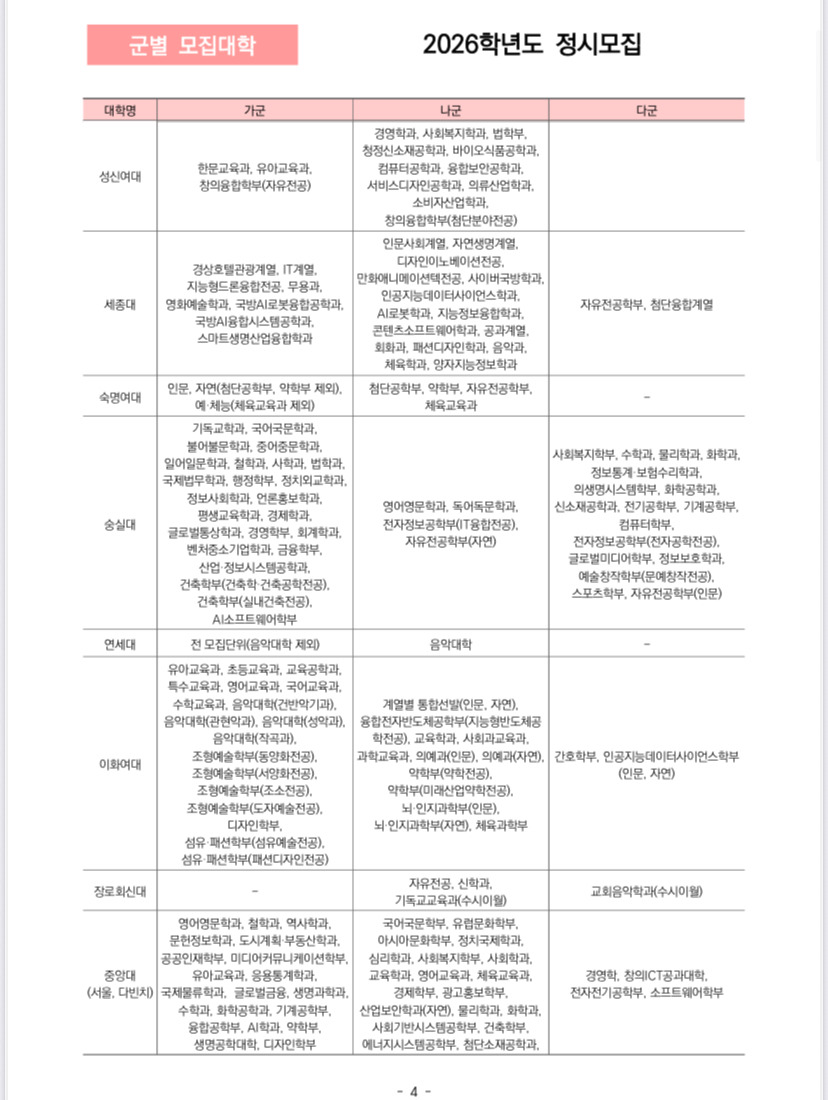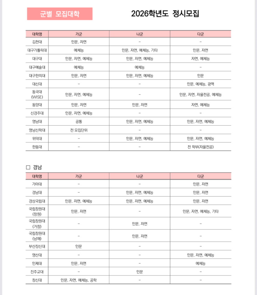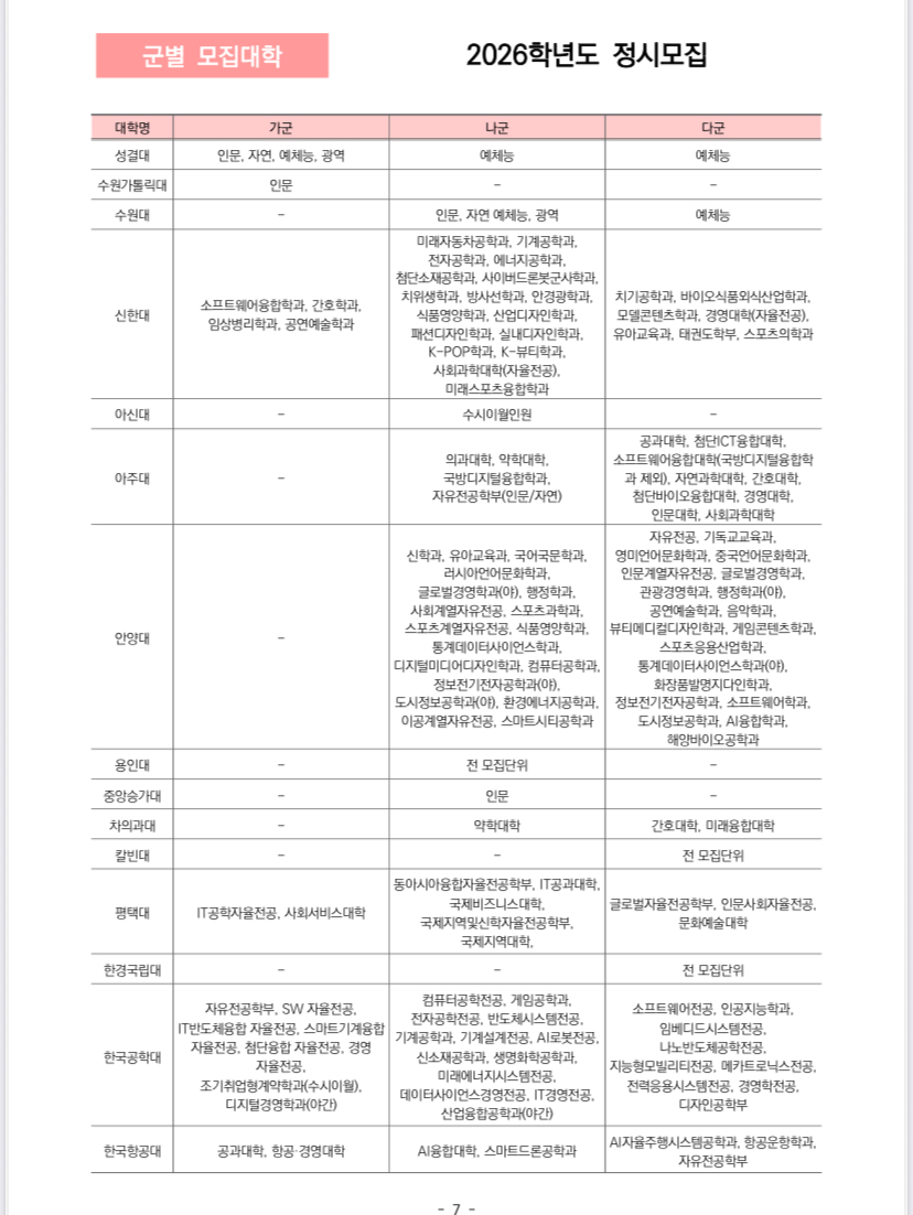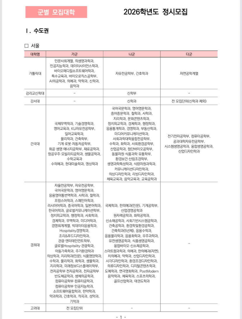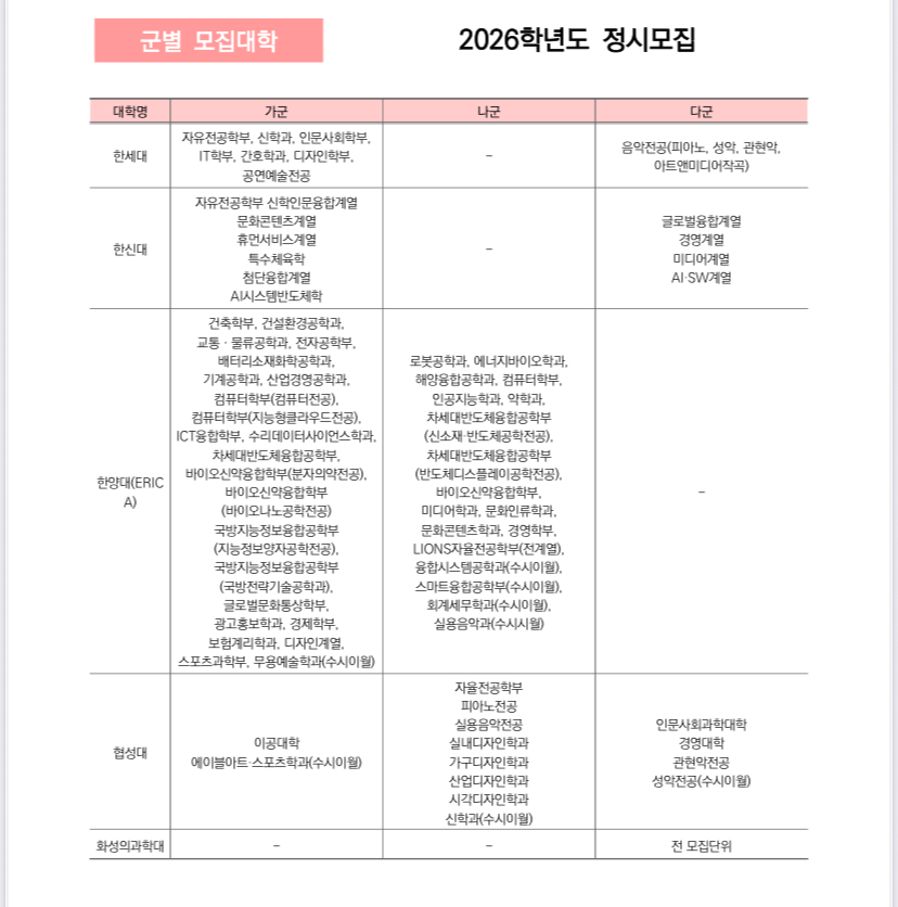 2026학년도 정시 가군, 나군, 다군 군별 모집대학 한꺼번에 정리