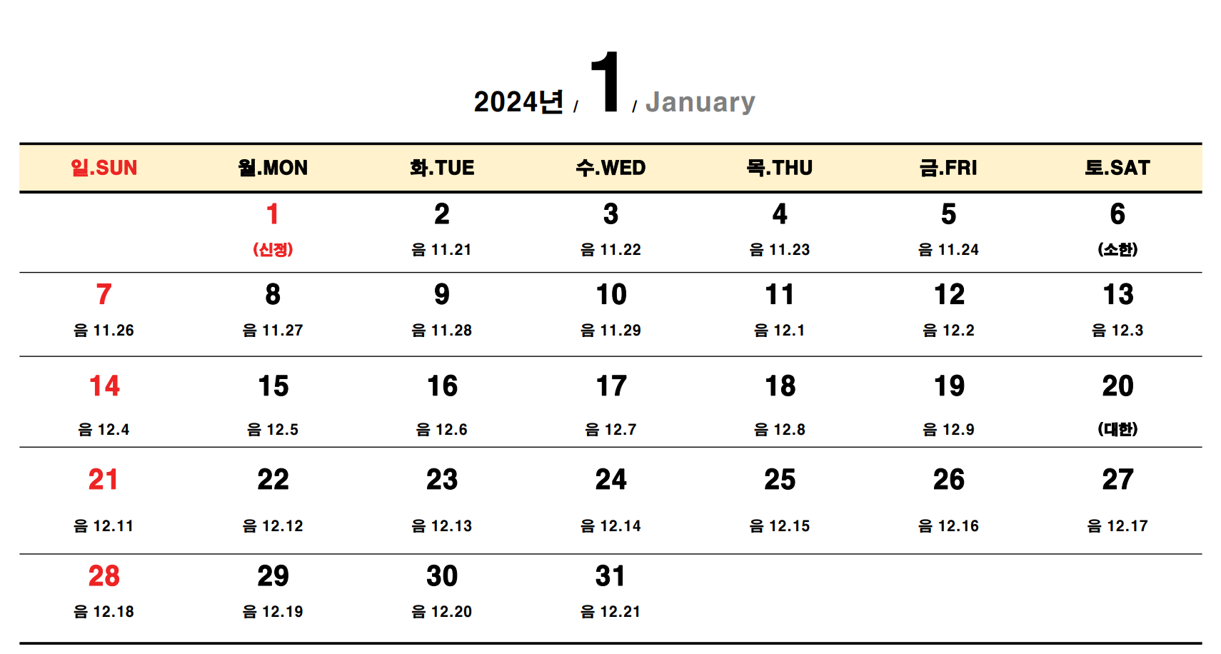 - 신정 (New Year's Day) - 1월 1일, 월요일
