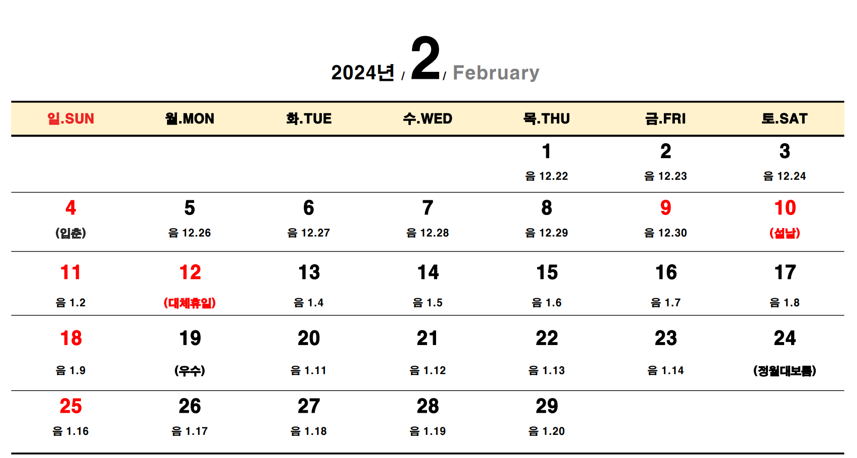 - 설날 (Seollal, Korean Lunar New Year's Day) - 2월 10일, 토요일 (공휴일이 주말과 겹치므로 대체 휴일 없음)