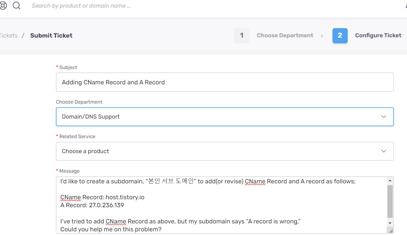 I’d like to create a subdomain, “본인 서브 도메인” to add(or revise) CName Record and A record as follows;