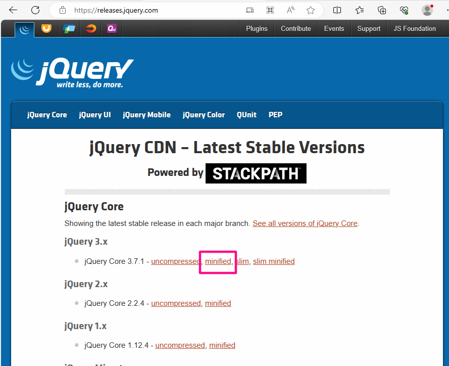 페이지에 들어가면 가장 최신버전 3.X 버전에 minified 버전을 사용하면 됩니다.