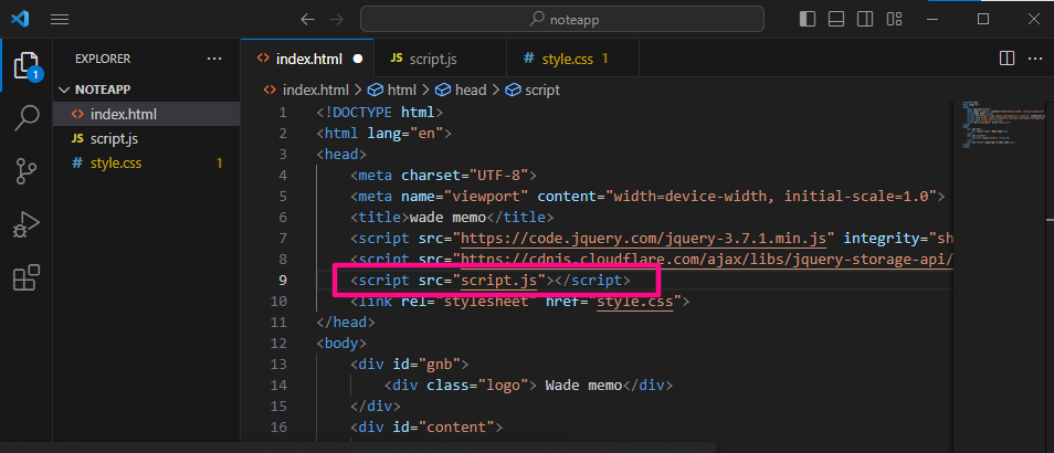 그다음 마찬가지로 index.html에 script 파일을 불러와 주면 됩니다. 아래 화면 처럼해주세요.