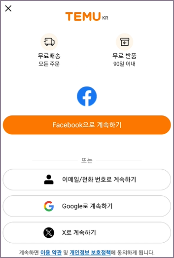 가입이 완료된 첫 테무의 첫 화면은 다음과 같습니다.